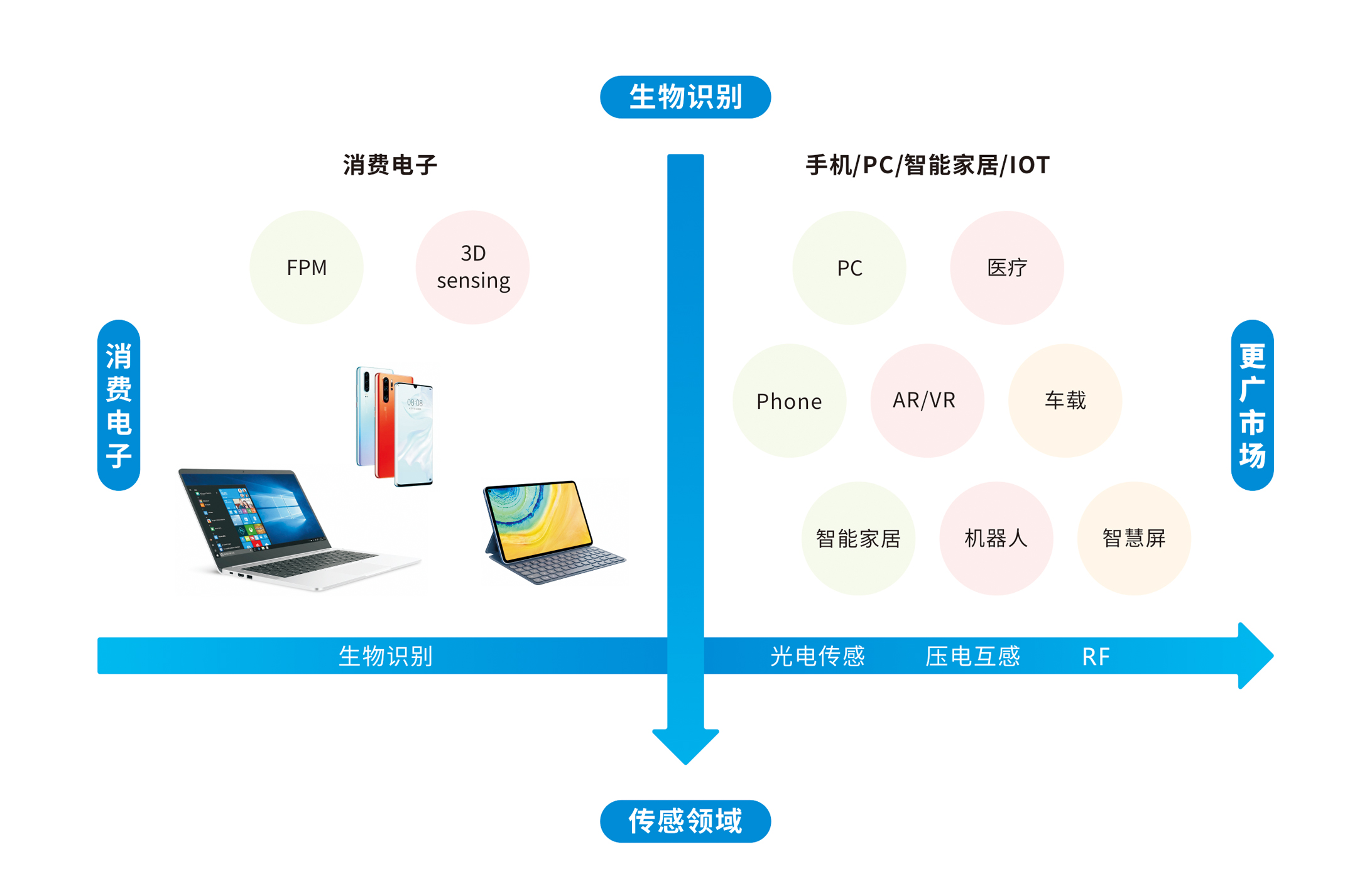 從指紋識別和人臉識別擴展到傳感器領(lǐng)域,產(chǎn)品類別由指紋和3DS向更多傳感器領(lǐng)域發(fā)展,產(chǎn)品領(lǐng)域由消費電子擴展向智能家居、人工智能、智能汽車、醫(yī)療、AR/VR等。